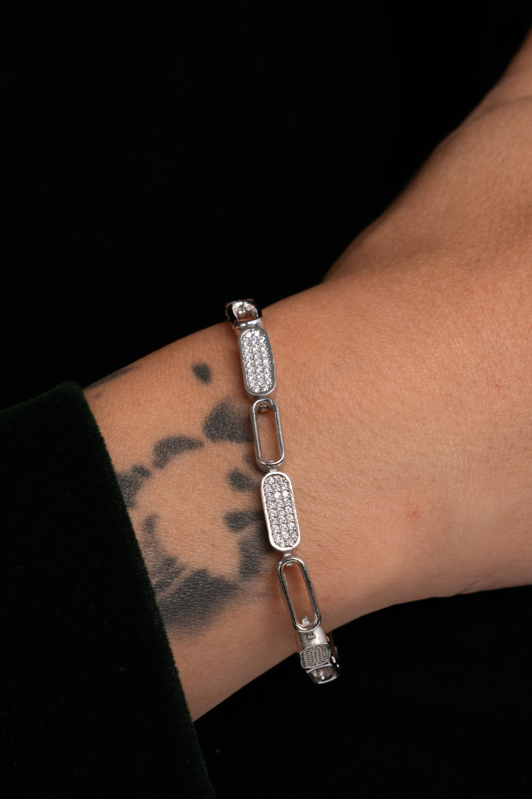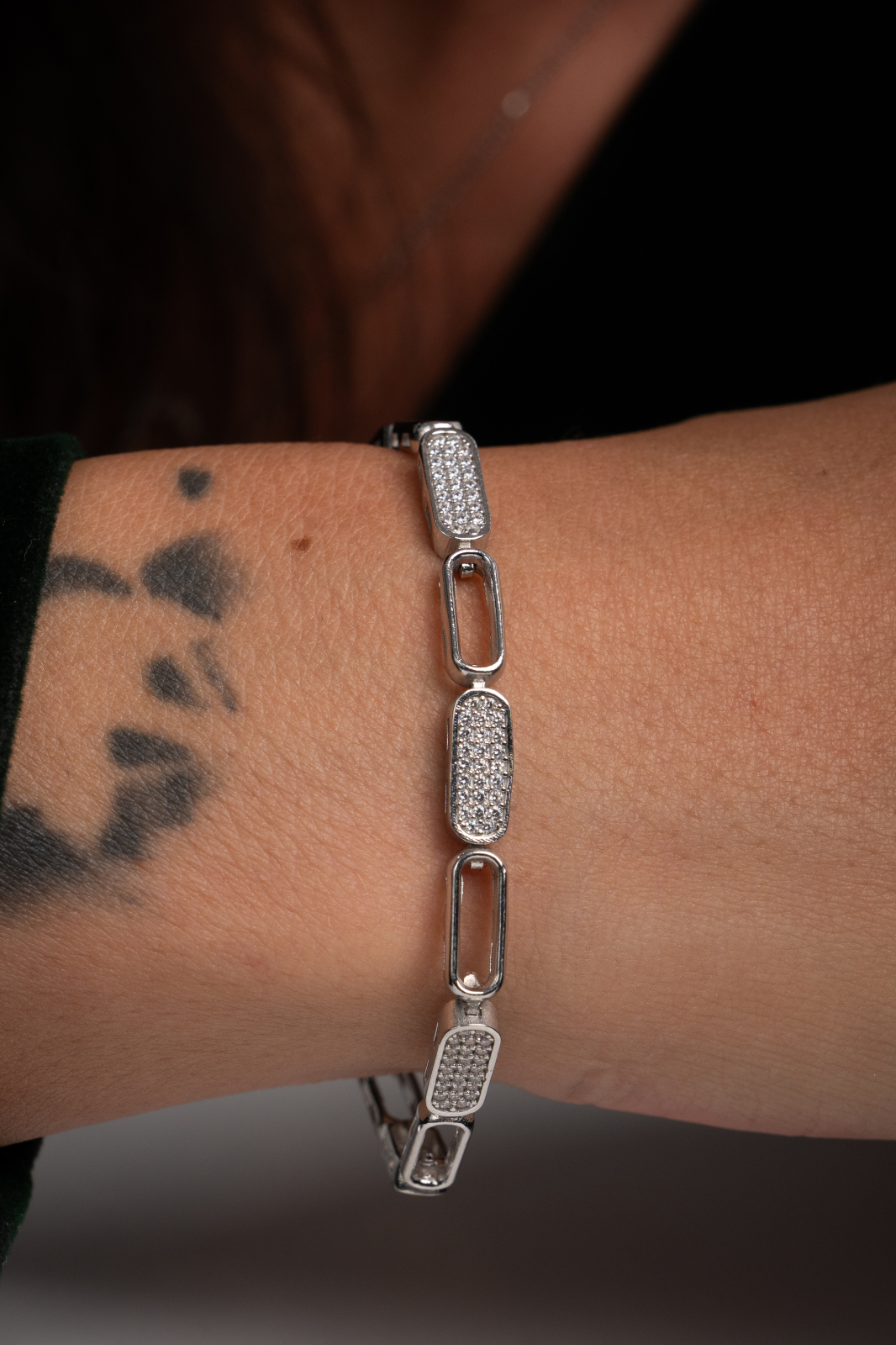 Brățara Dual Grace îmbină perfect echilibrul dintre strălucire și simplitate. Realizată din argint 925 rodiat, este formată dintr-o succesiune de zale ovale alternante — unele împodobite cu pietre de zirconiu fin montate, altele cu un design gol, minimalist, care adaugă ritm și rafinament compoziției.