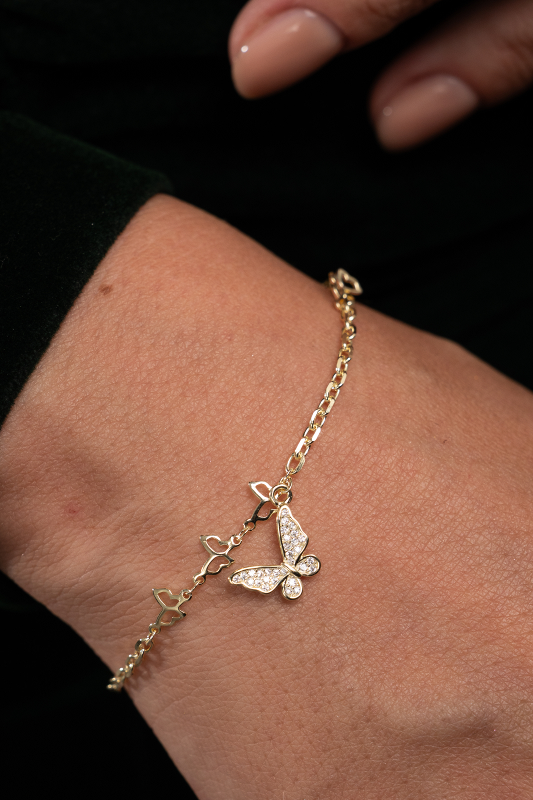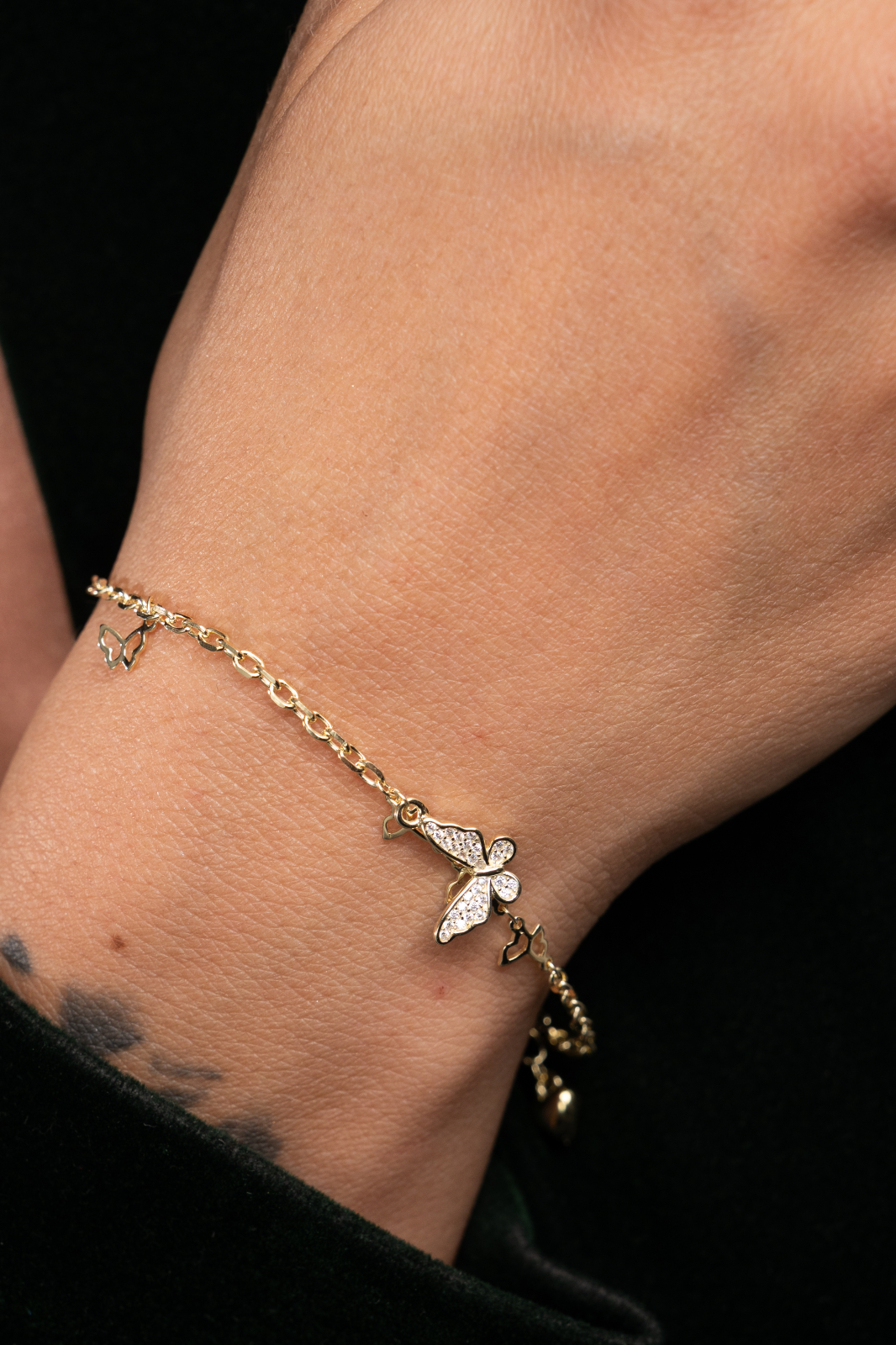 Brățara emană delicatețe și feminitate. Realizată din argint 925 placat cu aur 14K, aceasta prezintă o bază stilizată cu fluturi, decorați cu pietre de zirconiu strălucitoare și mici biluțe, care adaugă volum și textură bijuteriei.