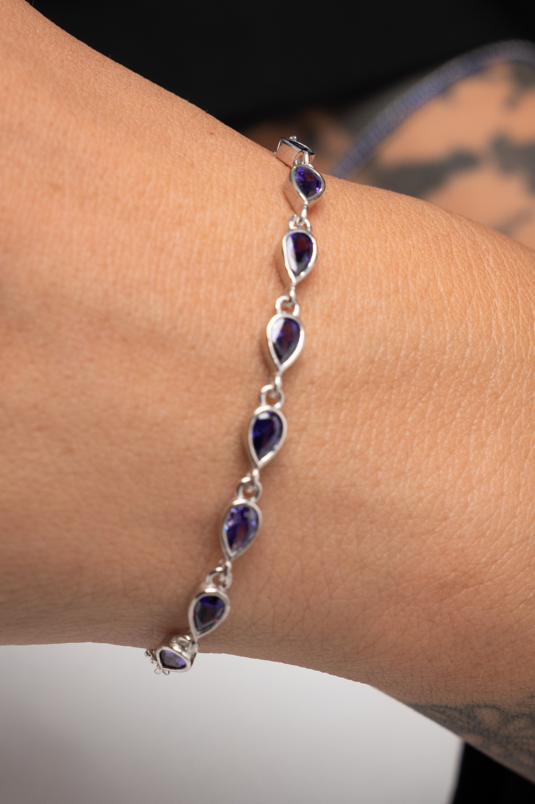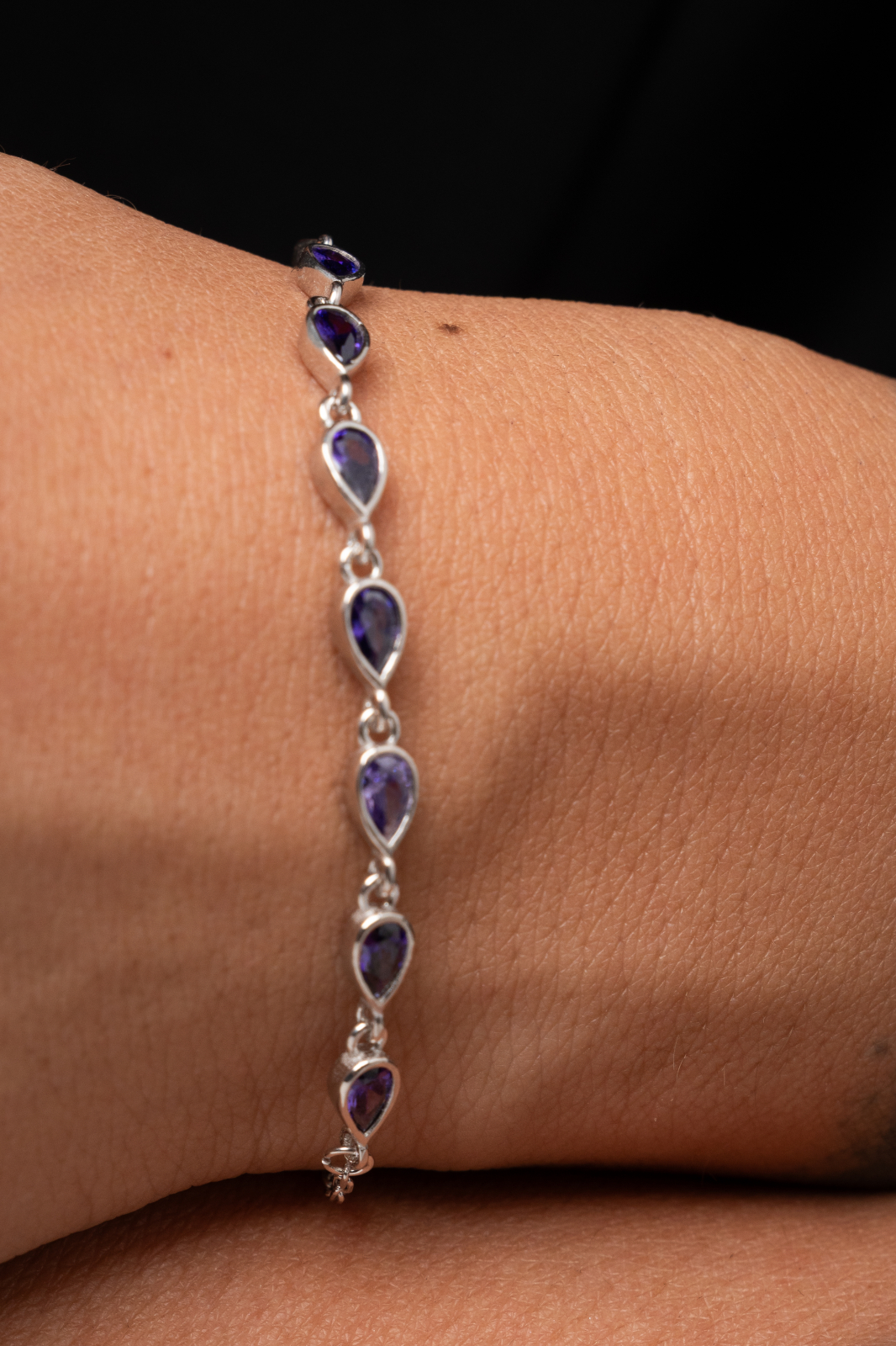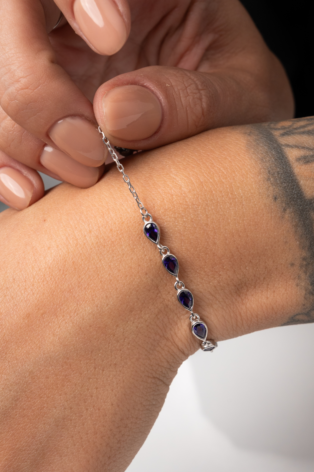 Eleganță feminină și strălucire subtilă. Brățara este realizată din argint 925 rodiat, decorată cu pietre de zirconiu mov tăiate în formă de lacrimă, care emană rafinament și romantism. Fiecare piatră este atent montată pentru a capta lumina din orice unghi, oferind o strălucire intensă și un efect sofisticat.
