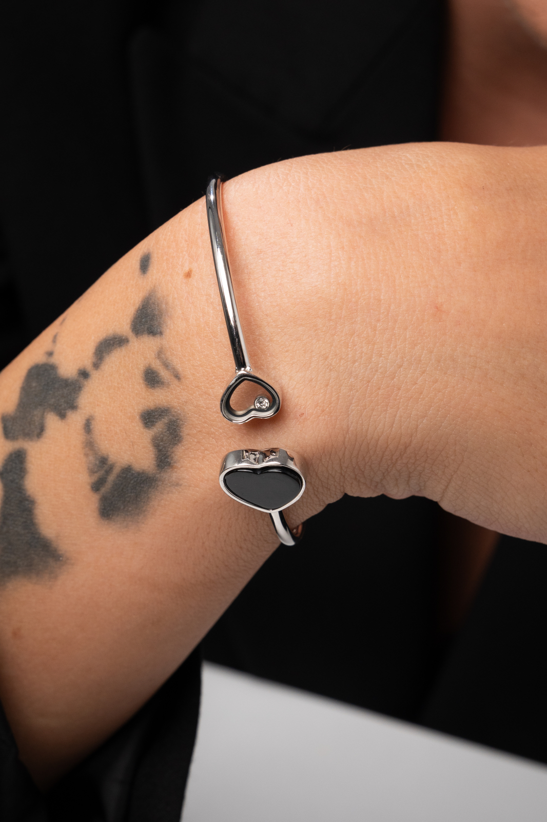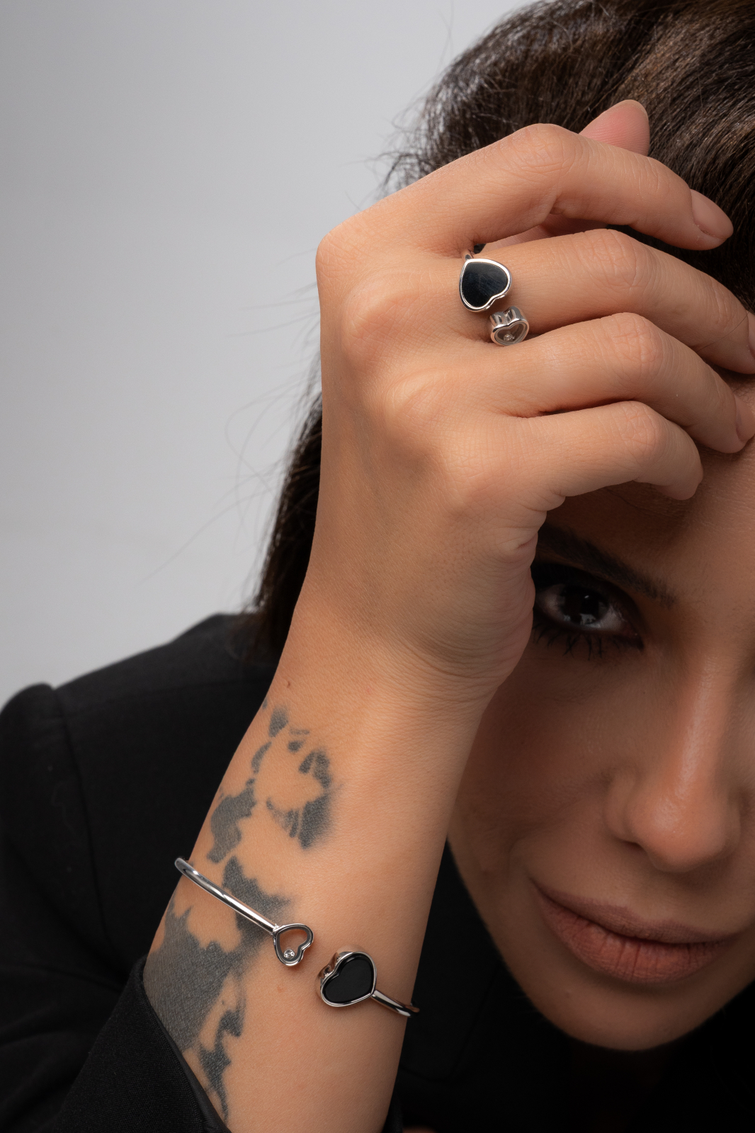 Această brățară tip manșetă din argint 925 rodiat , 5.8 grame, atrage privirile prin designul său curat și detaliul central – o inimă neagră, încărcată de mister și emoție. Inima simbolizează iubirea profundă, iar culoarea sa – forță, independență și rafinament.