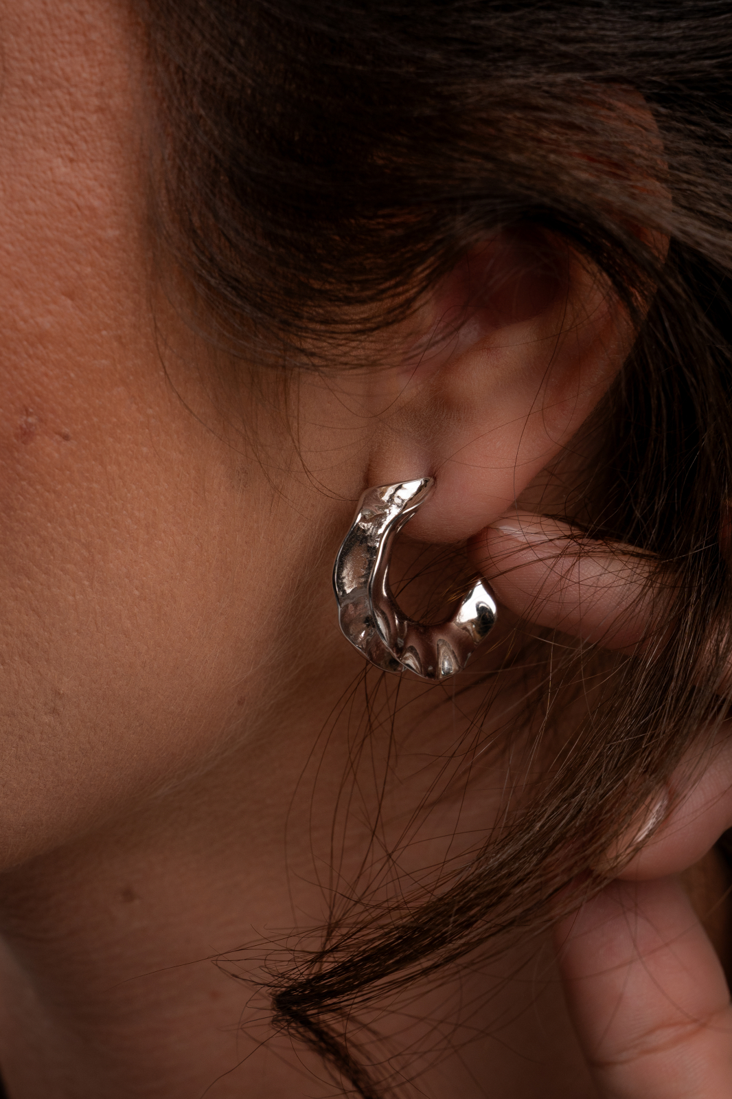 Realizați din argint 925 rodiat, acești cercei se remarcă prin designul lor organic și asimetric, inspirat din formele fluide ale naturii.
