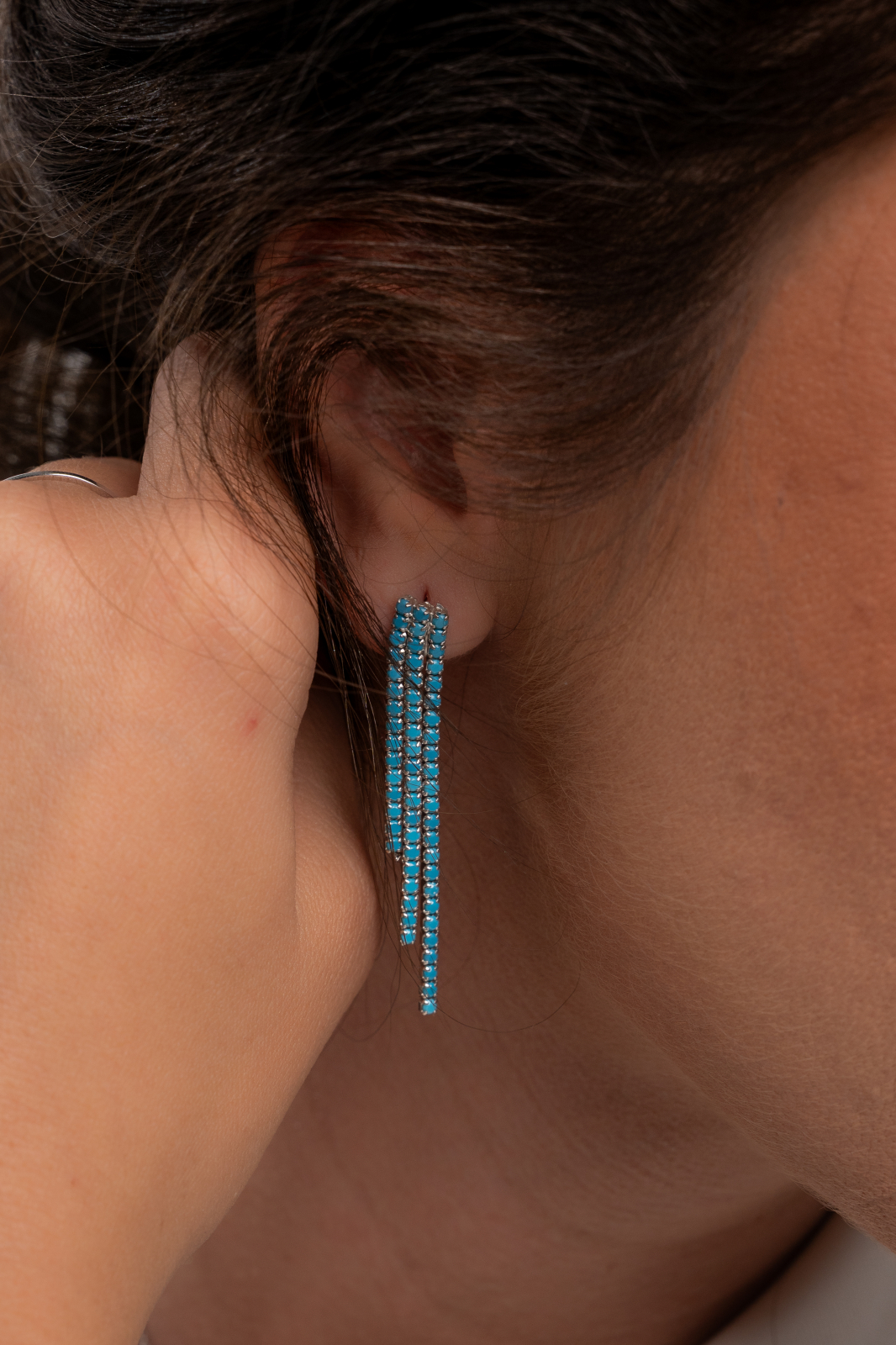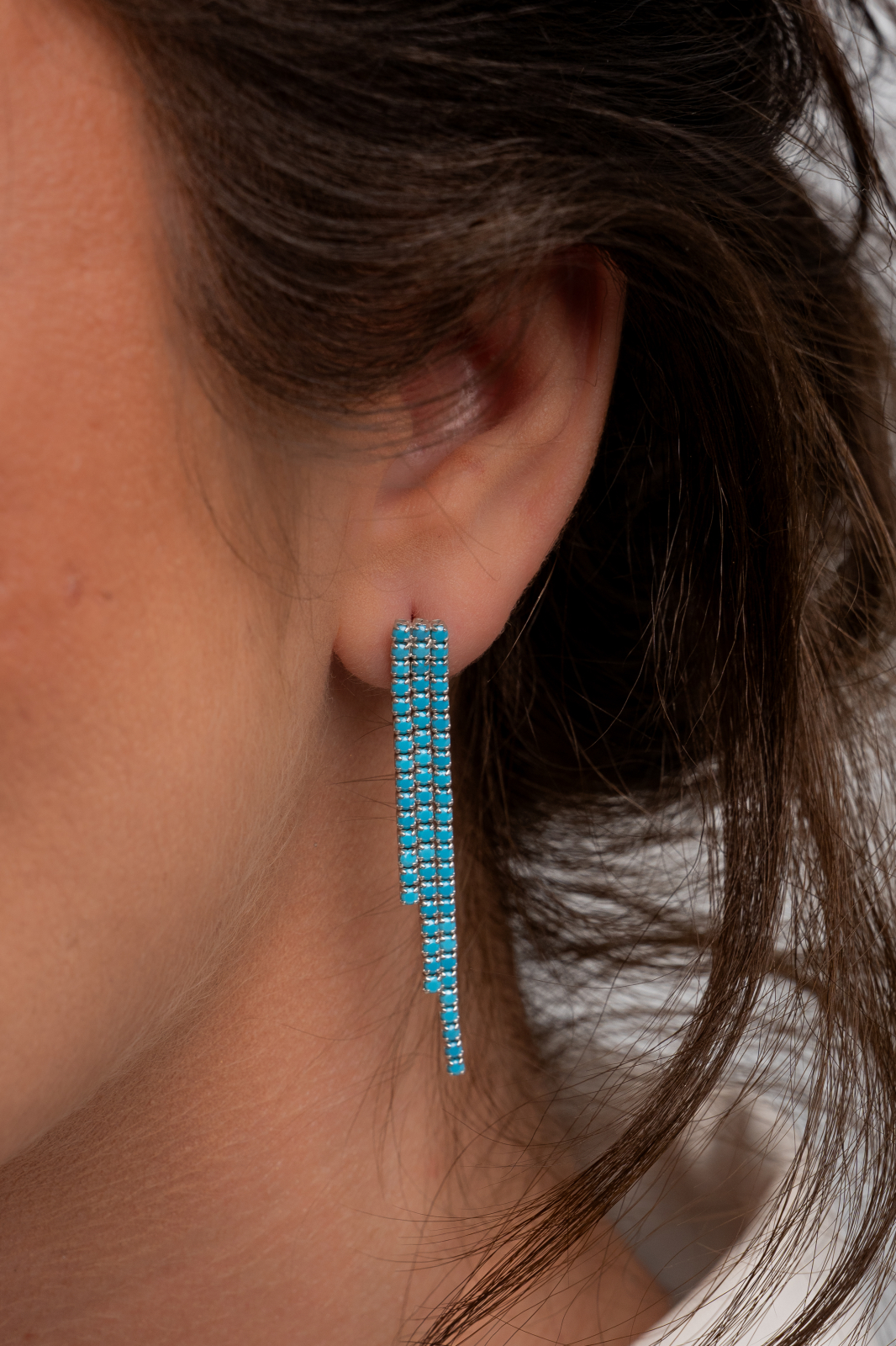 Cercei eleganți și moderni, realizați în stil tennis,cu trei șiruri fine împodobite cu pietre turcoaz. Designul lor fluid și simetric creează un efect de cascadă, aducând strălucire și prospețime fiecărui pas. O alegere rafinată pentru un look contemporan, cu accente boeme și vibrante.
