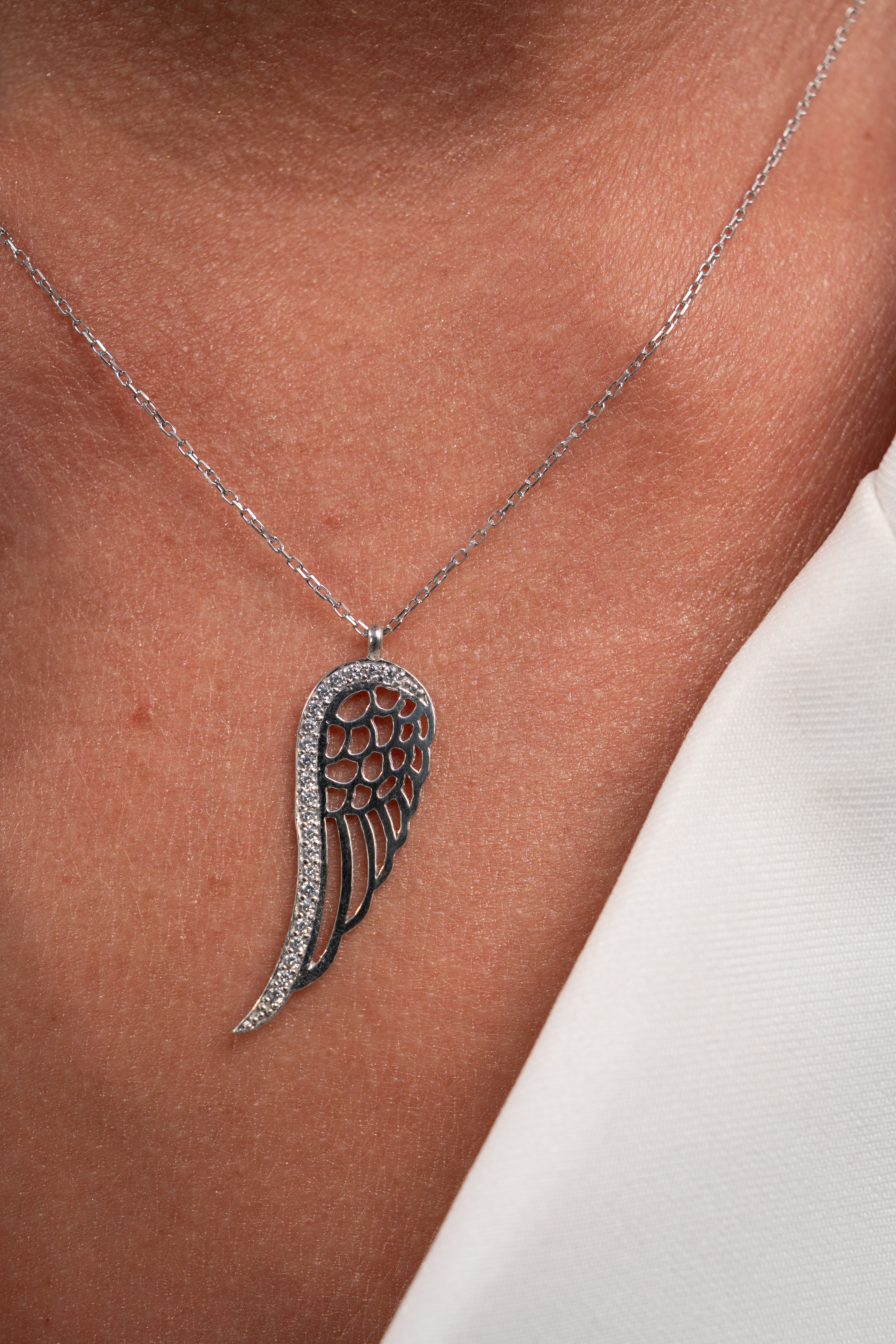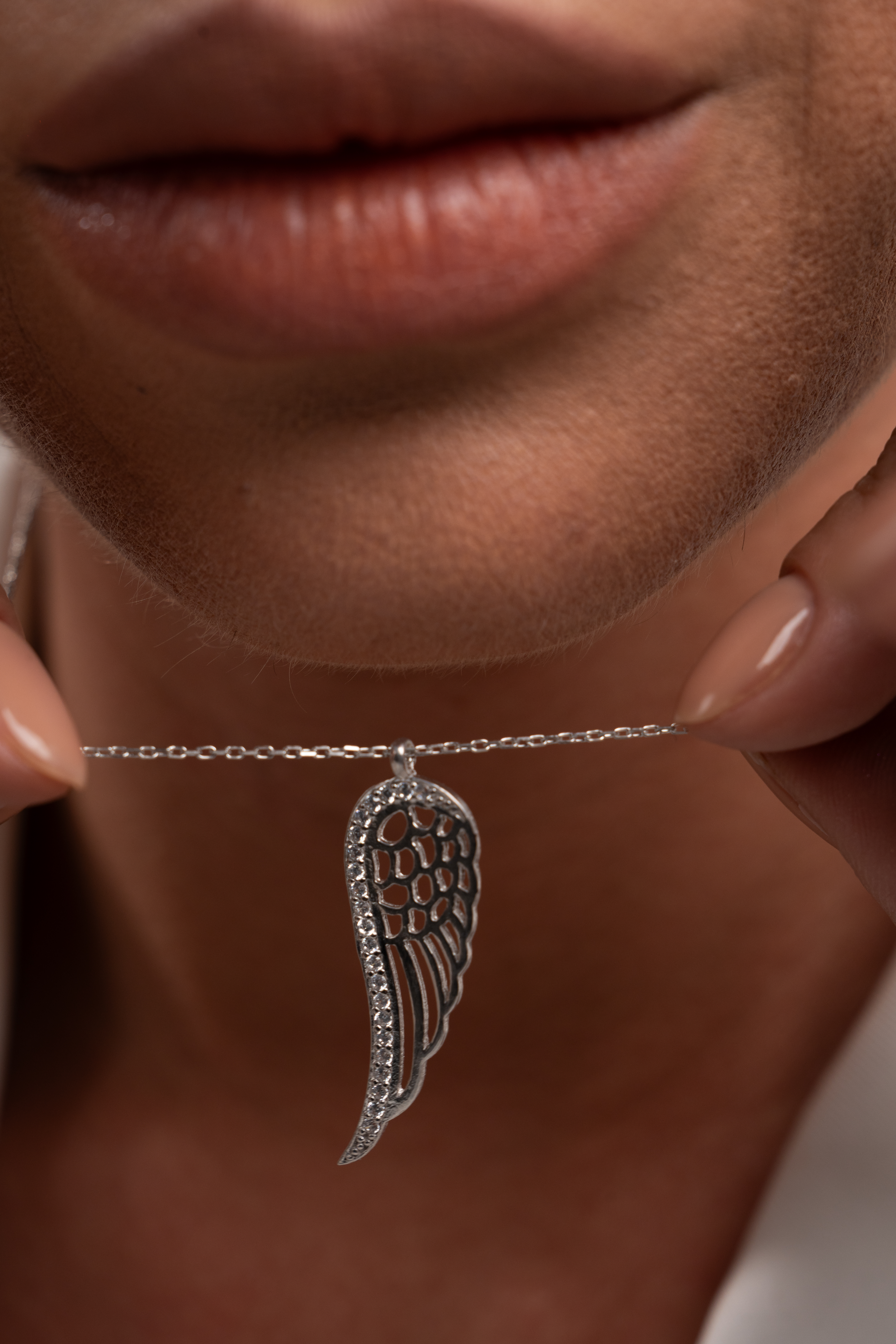 Poartă cu tine o rază de lumină și protecție divină cu acest colier fin, realizat din argint rodiat, ce poartă un pandantiv în formă de aripă de înger. Fiecare detaliu al aripii surprinde grația și delicatețea zborului ceresc, amintindu-ți că nu ești niciodată singur/ă. Strălucirea rodiului amplifică farmecul bijuteriei, făcând-o să radieze puritate și speranță, acompaniindu-te în fiecare clipă cu eleganță și tandrețe.