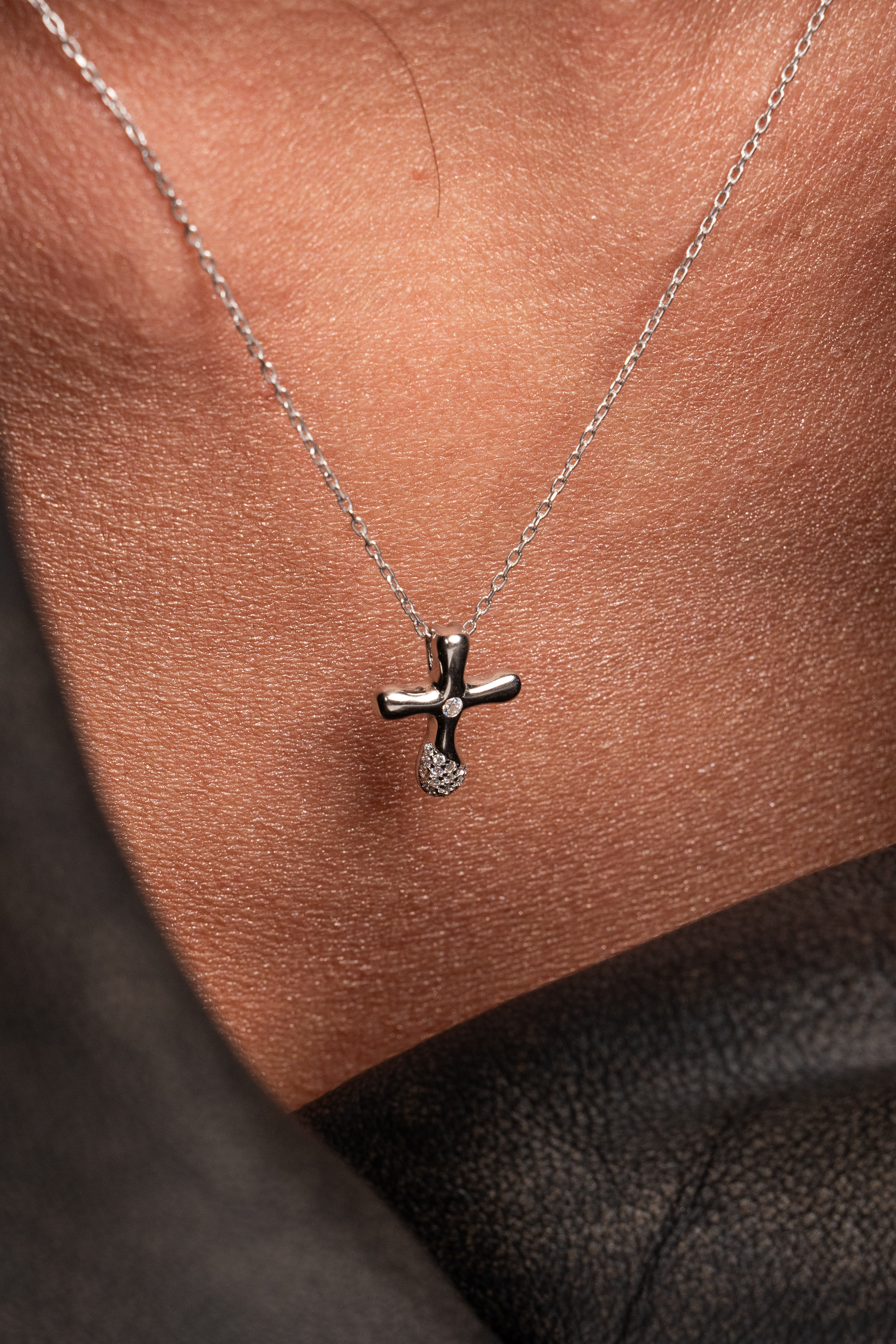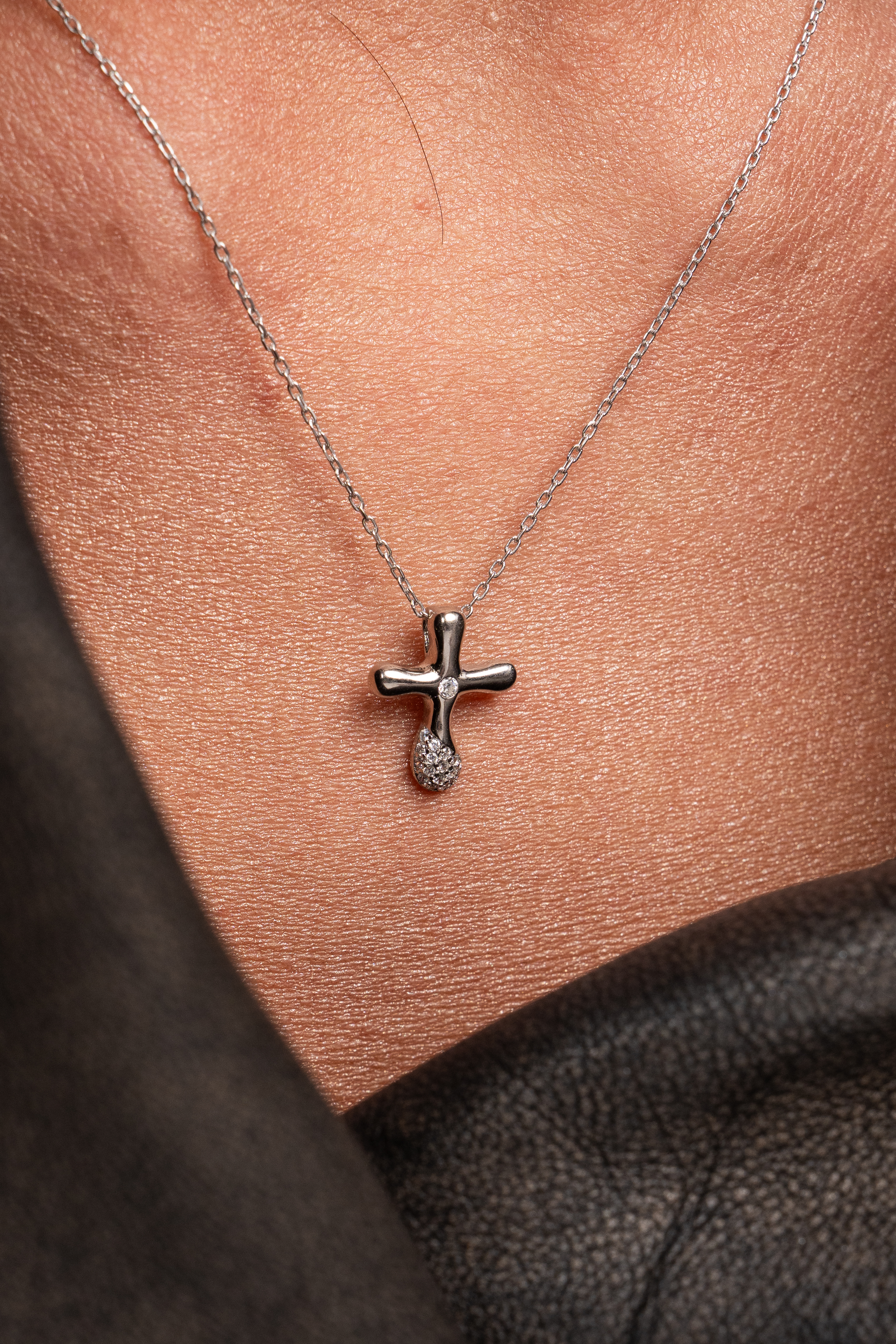 Un simbol clasic al credinței și eleganței, acest colier din argint 925 rodiat este împodobit cu un pandantiv în formă de cruce, delicat încrustat cu pietre albe de zirconiu ce îi oferă un strălucire rafinată și luminoasă. Placarea cu rodiu asigură un finisaj impecabil, ce protejează bijuteria împotriva oxidării și păstrează luciul său de durată.