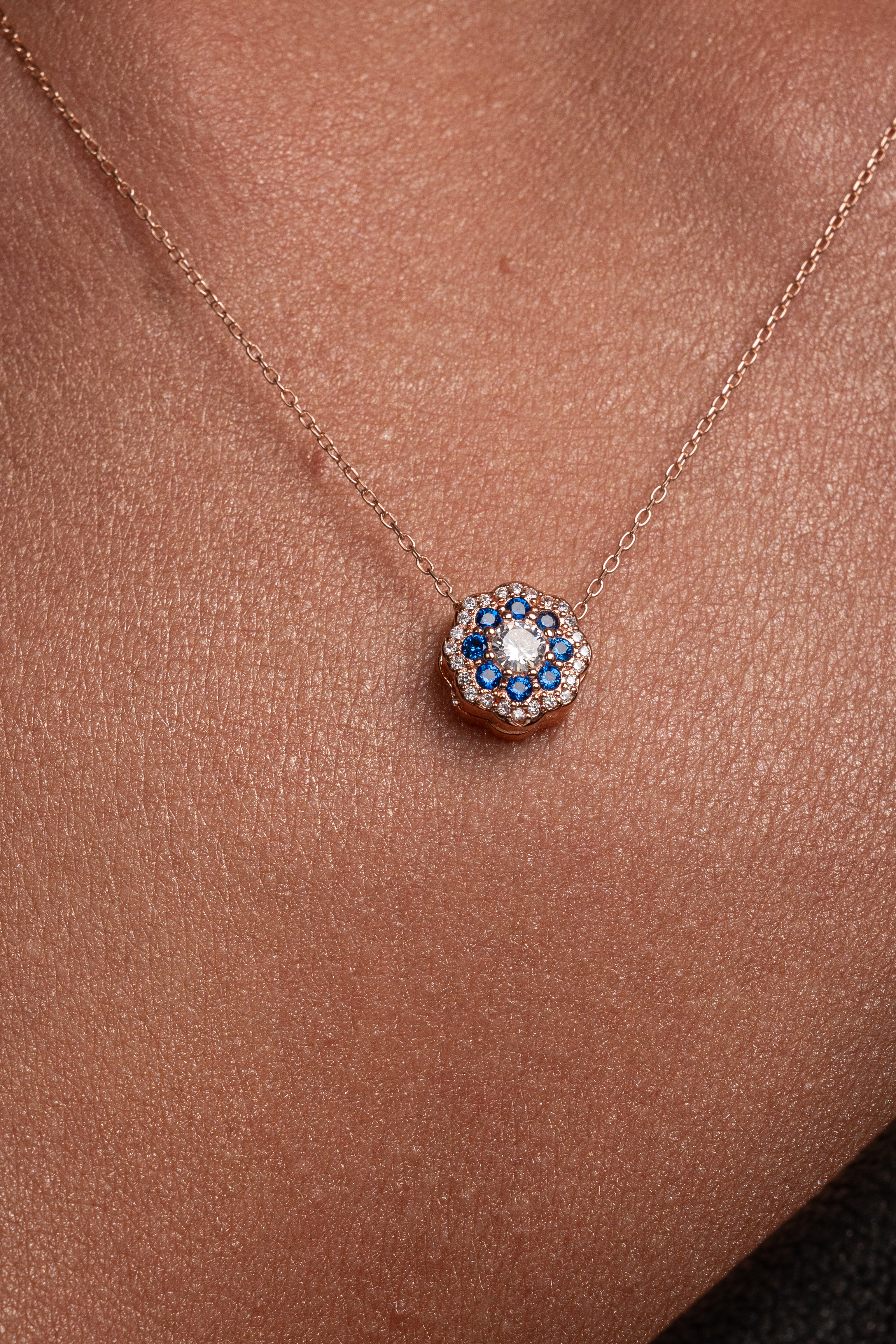 este o expresie a feminității delicate și a norocului purtat cu stil. Realizat din argint 925 placat cu aur roz de 14K, bijuteria are un pandant rotund în formă de floare cu multiple petale, decorat cu pietre de zirconiu albe și roz ce captează lumina din orice unghi.