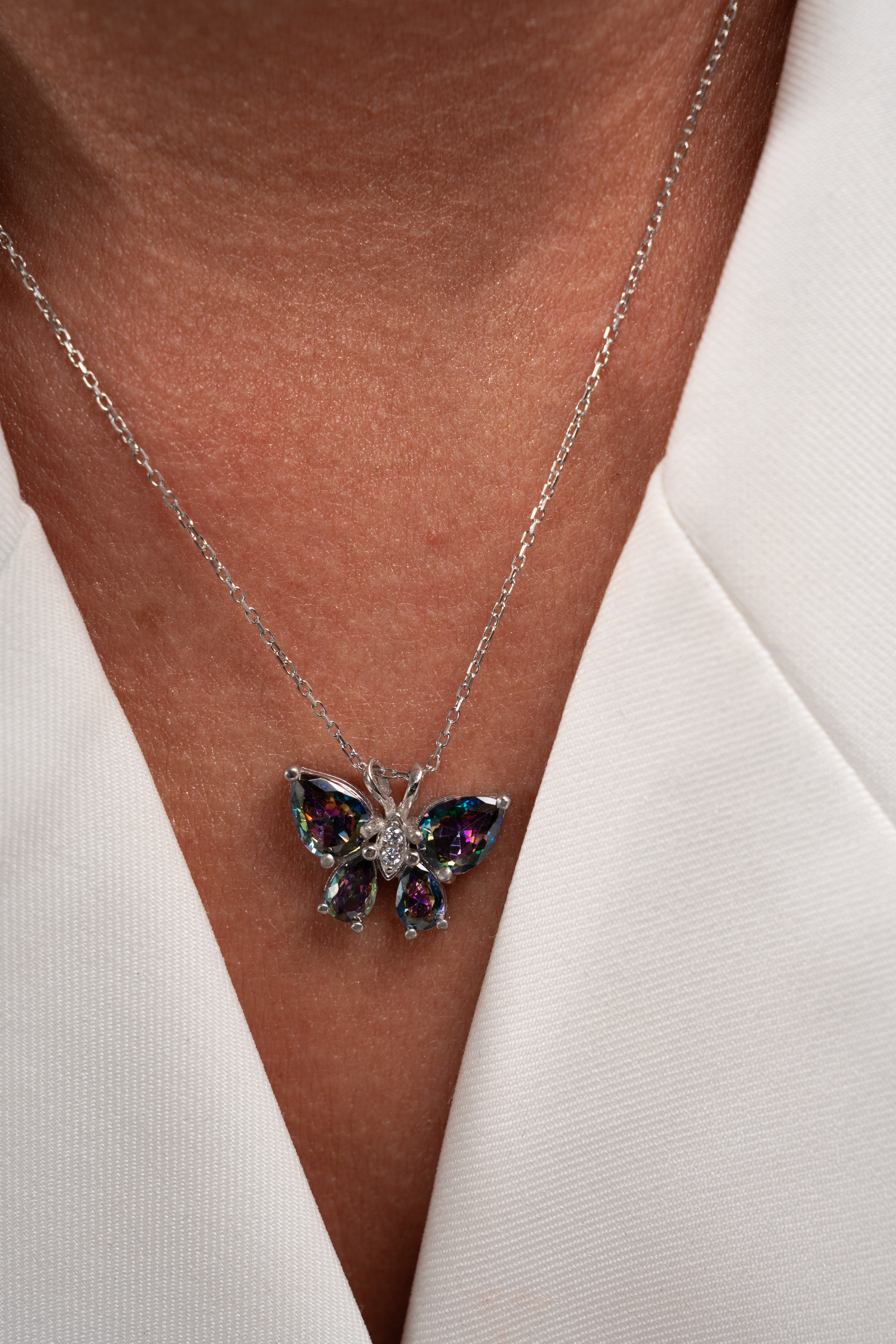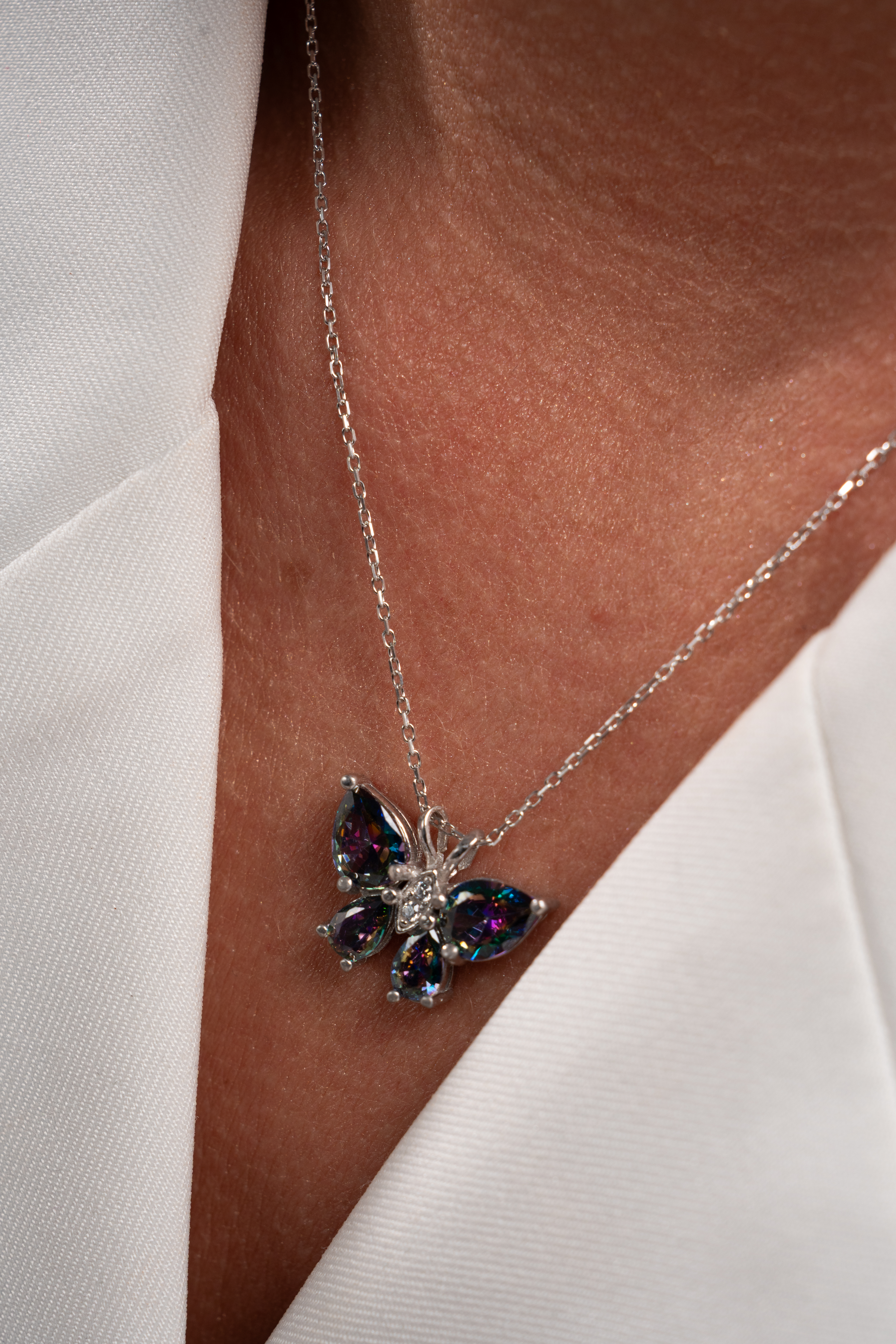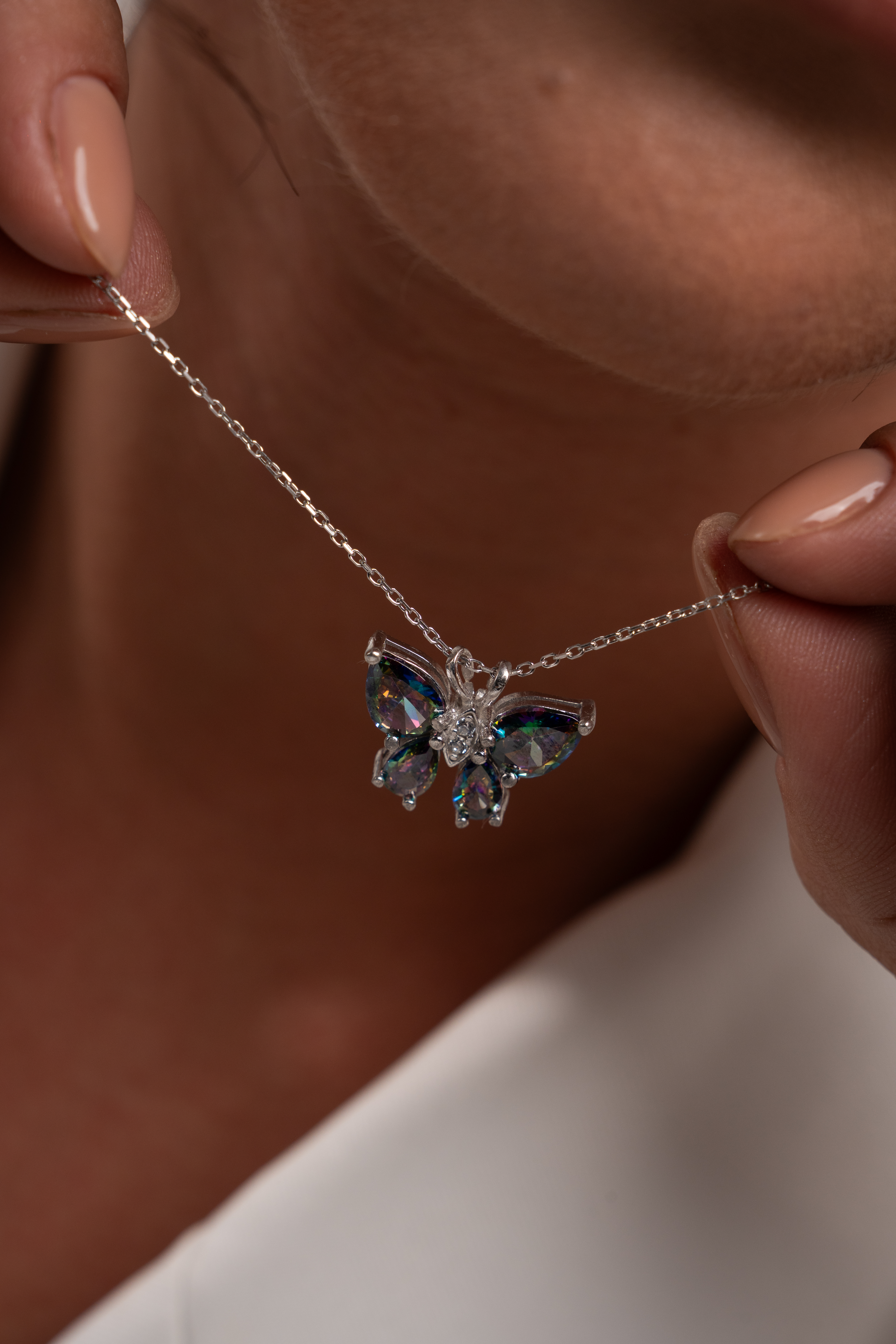 Un simbol al transformării și al libertății, acest colier delicat din argint 925 rodiat captează frumusețea efemeră a unui fluture în zbor. Pandantivul, cu un design detaliat în formă de fluture, este împodobit în nuanțe vibrante ale curcubeului, creând un joc fascinant de culori și lumină. Placarea cu rodiu oferă un luciu elegant și o protecție suplimentară împotriva oxidării, păstrând strălucirea bijuteriei timp îndelungat.