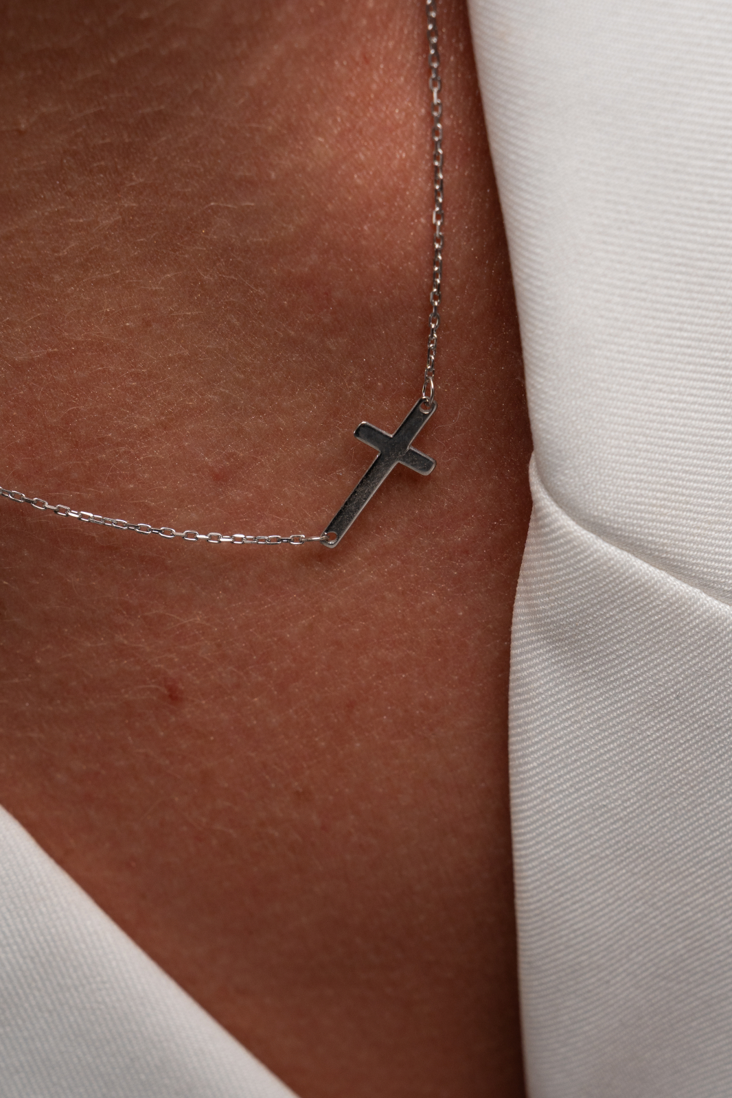 Crucea orizontală devine un element de echilibru — o reinterpretare modernă a unui simbol clasic, purtat aproape de inimă