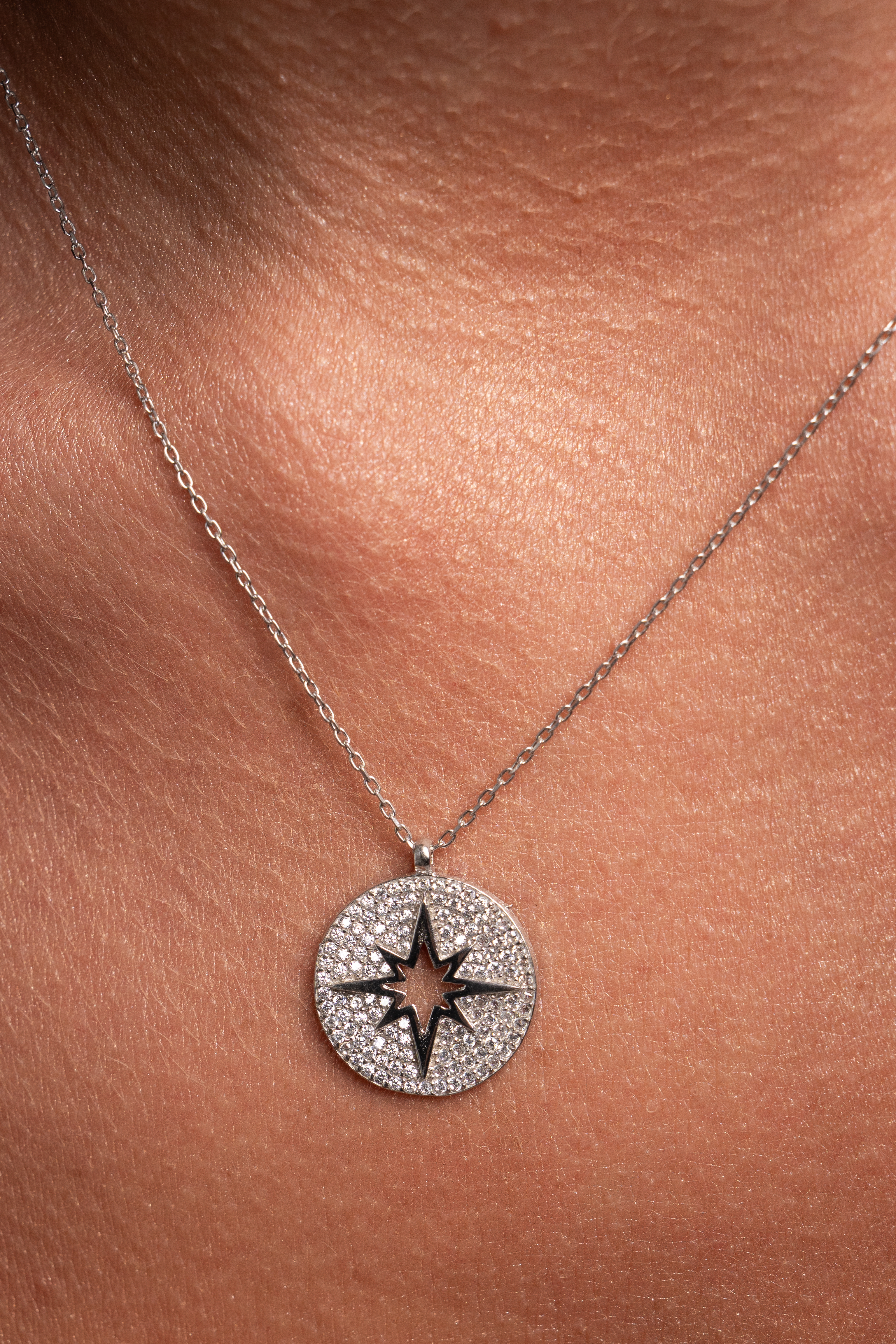 Colierul  adaugă un strop de mister și rafinament oricărei ținute. Realizat din argint 925 rodiat, pandantul în formă de Steaua Nordului este decorat cu pietre de zirconiu alb, care oferă un contrast subtil și elegant, evidențiind designul simbolic.