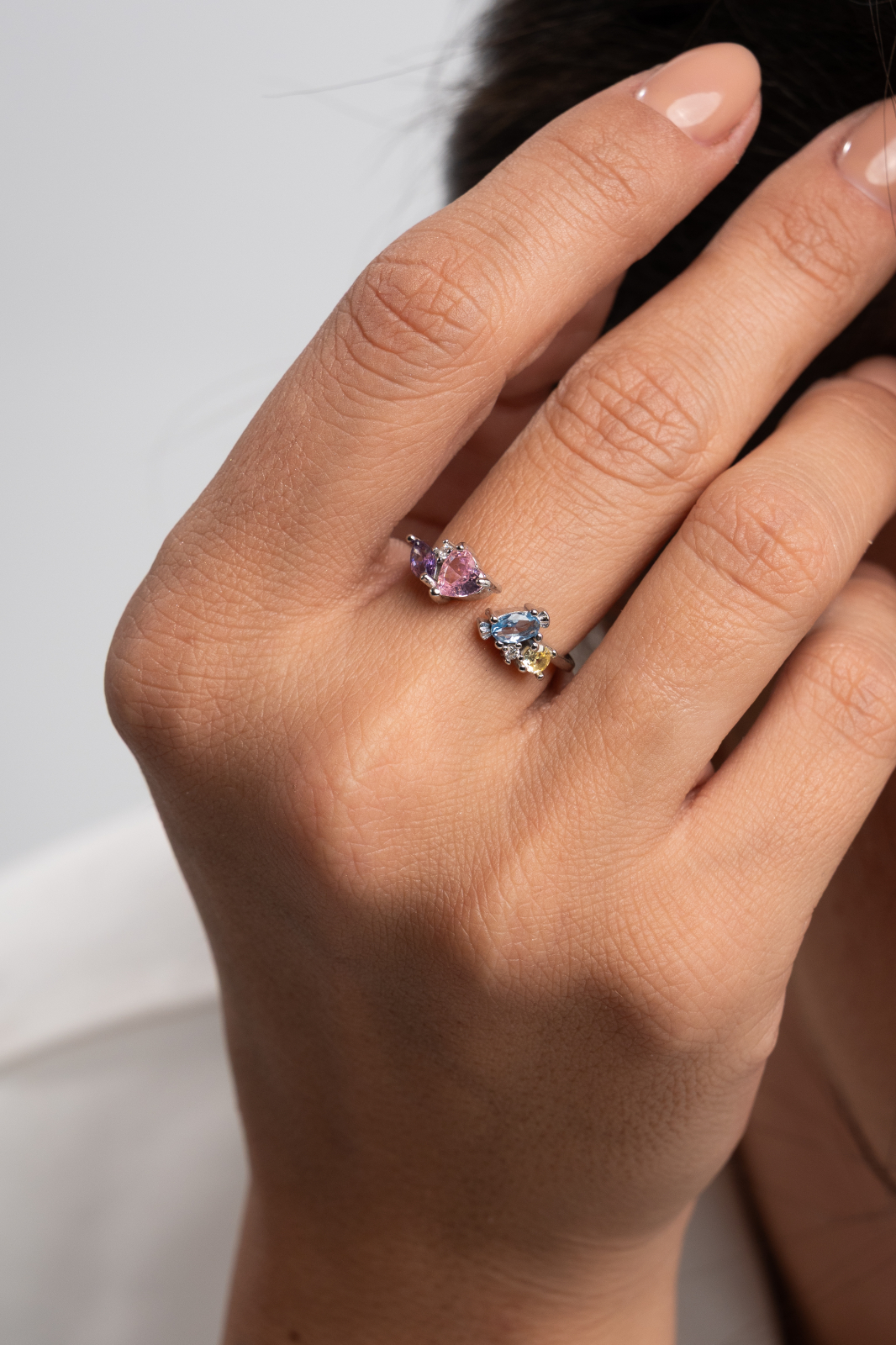 Realizat din argint 925 rodiat, acest inel reglabil este decorat cu pietre colorate, care captează lumina și adaugă un efect jucăuș și vesel fiecărei ținute.