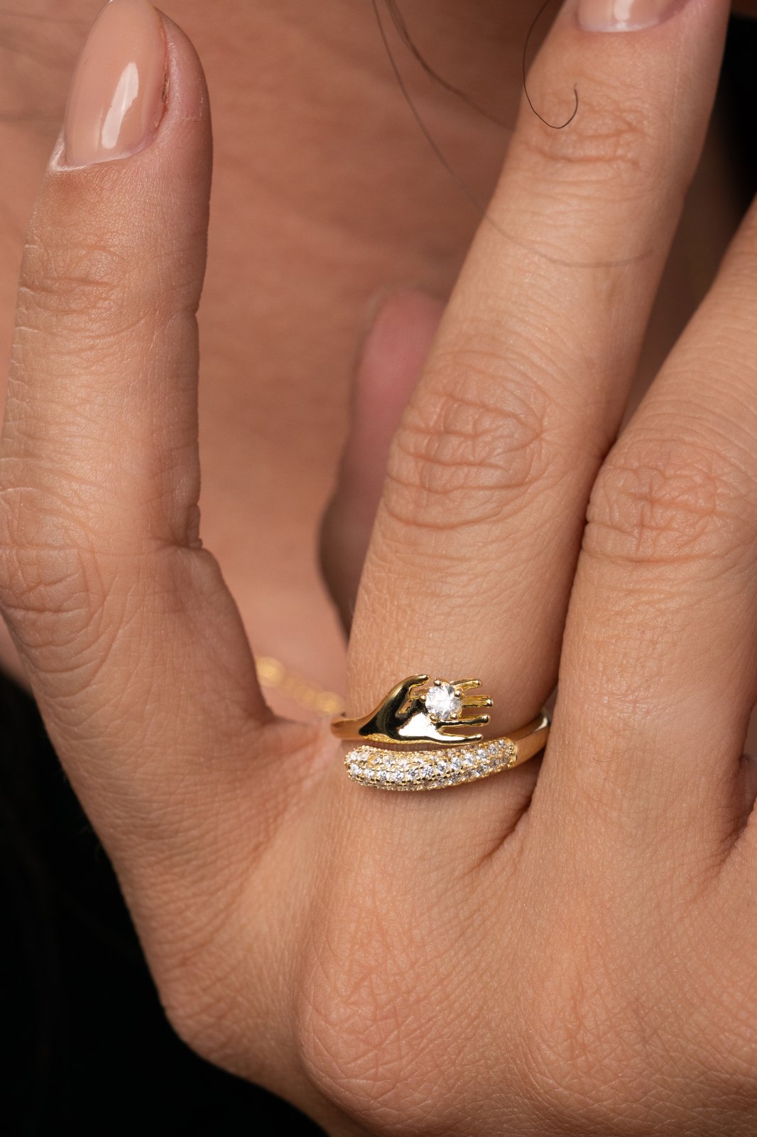 Realizat din argint 925 placat cu aur de 14k, acest inel reglabil se termină într-o mânuță fină, împodobită cu pietre de zirconiu care captează lumina la fiecare mișcare.