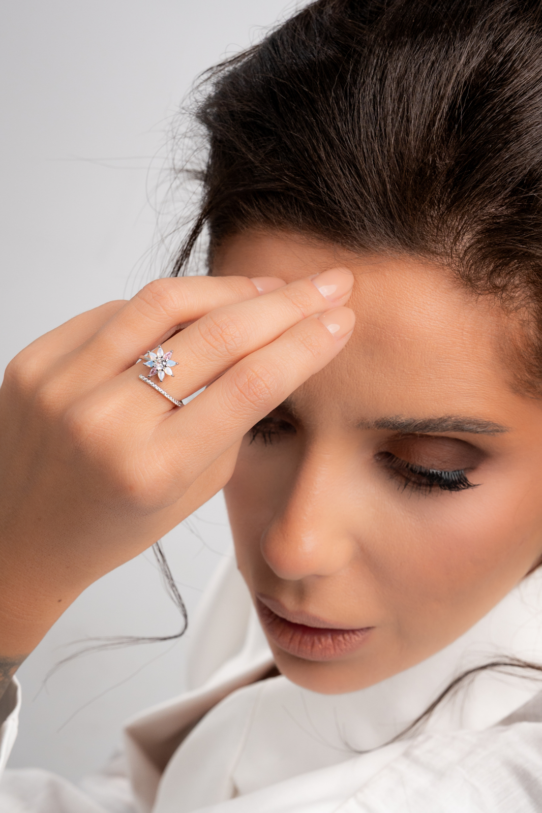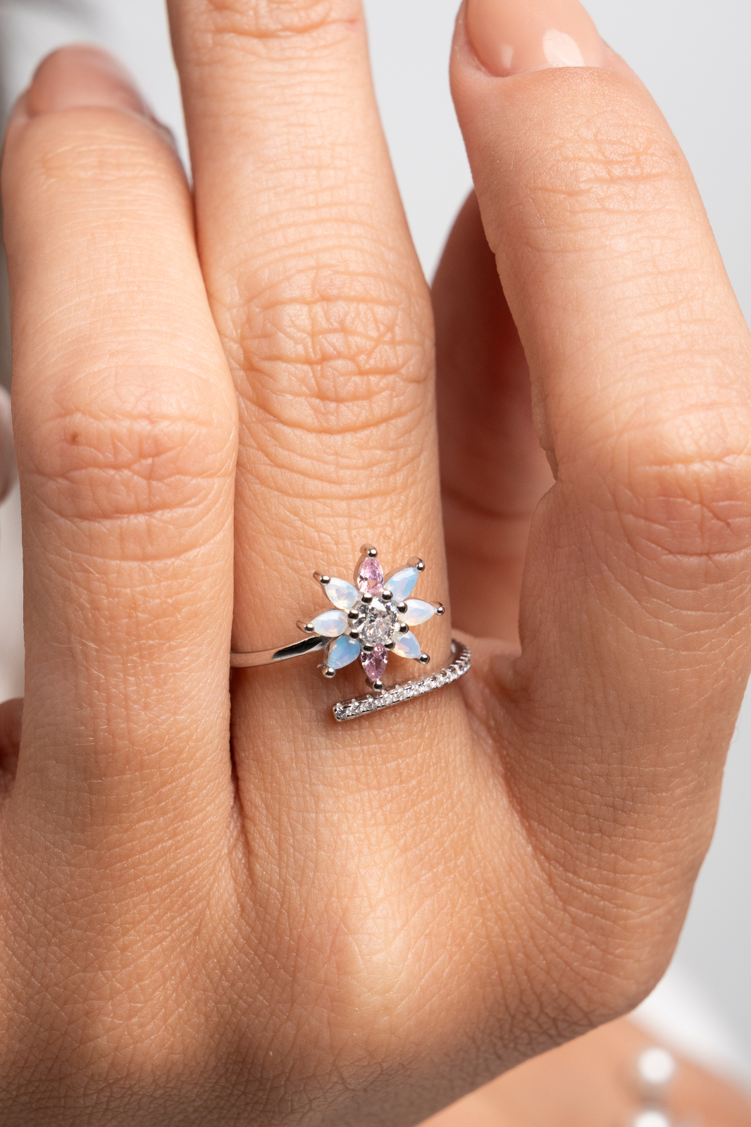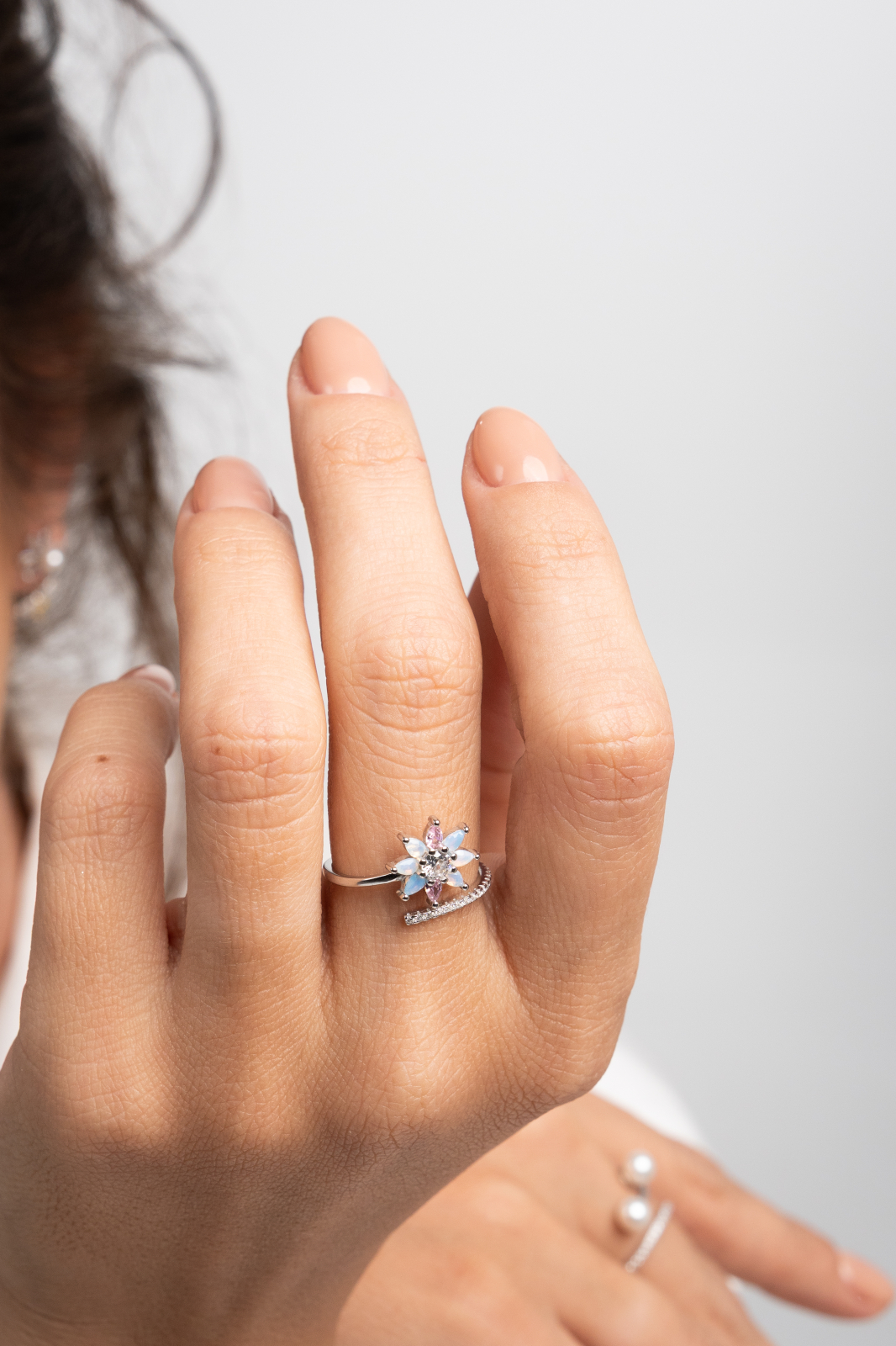 Inel reglabil din argint rodiat, cu terminație în formă de floare delicată, decorată cu pietre de zirconiu roz și bleu. Un accesoriu feminin și rafinat, perfect pentru a adăuga un strop de culoare și eleganță oricărei ținute.