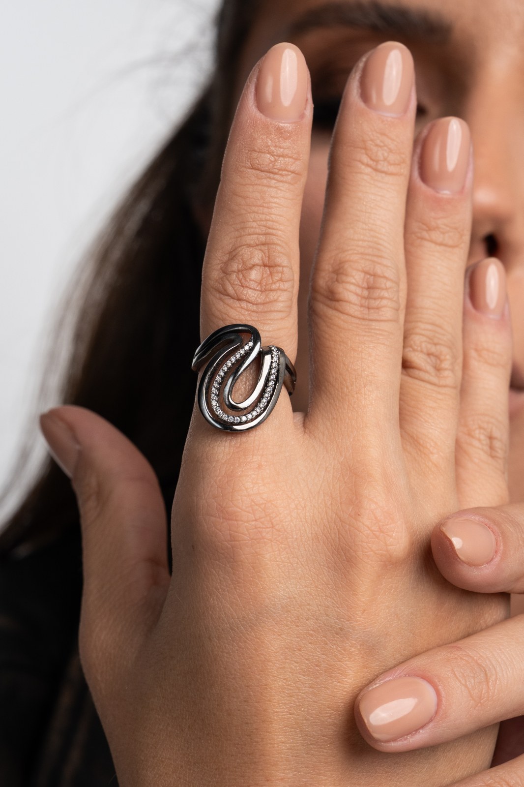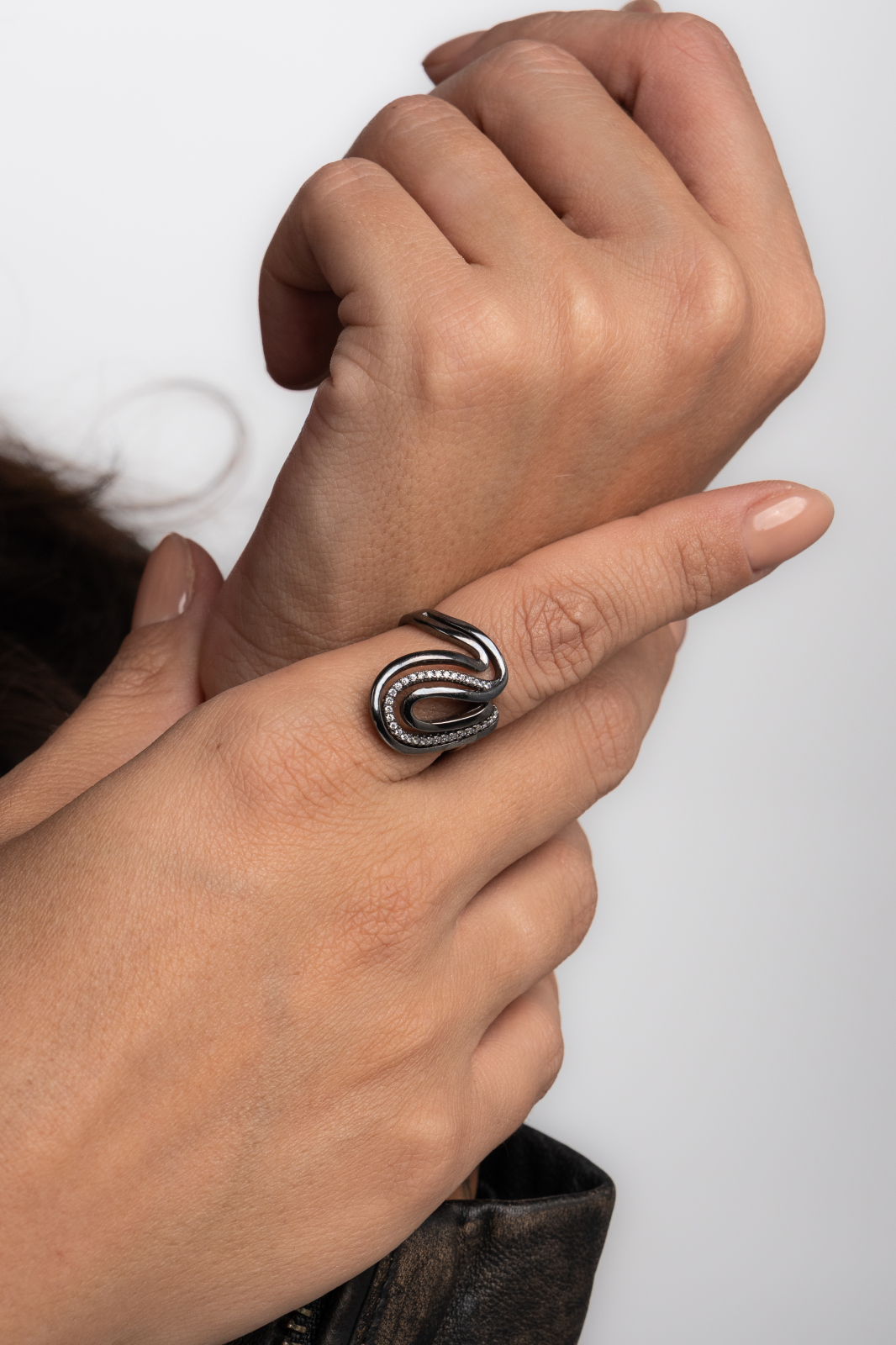 Inel din argint rodiat negru, cu un design îndrăzneț și neconvențional, ce exprimă individualitate și stil autentic. Finisajul întunecat subliniază atitudinea rebelă a piesei, iar forma modernă o face accesoriul perfect pentru cei care aleg să iasă din tipare și să își afirme personalitatea.