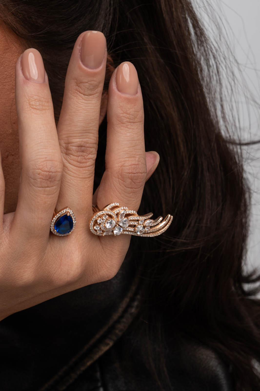 Inel modern și îndrăzneț, conceput pentru două degete, ce combină eleganța unei pietre albastre strălucitoare cu un detaliu delicat în formă de aripă pe celălalt deget. Designul asimetric aduce un aer sofisticat și avangardist, ideal pentru un look contemporan cu personalitate distinctă.