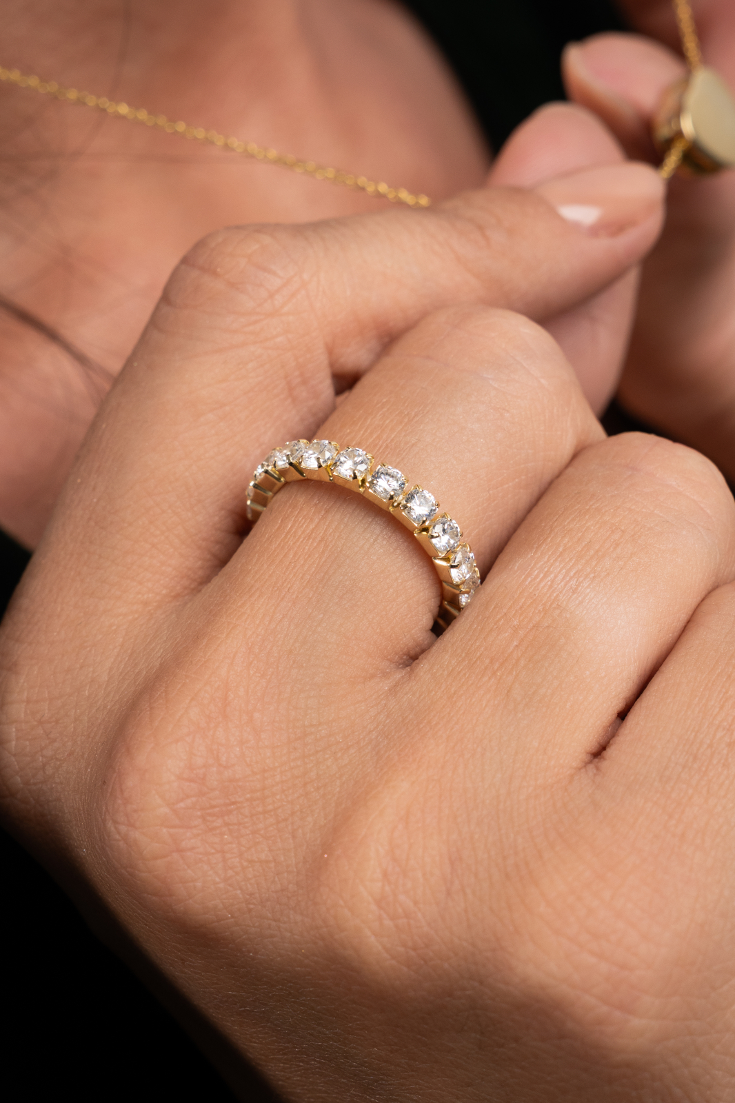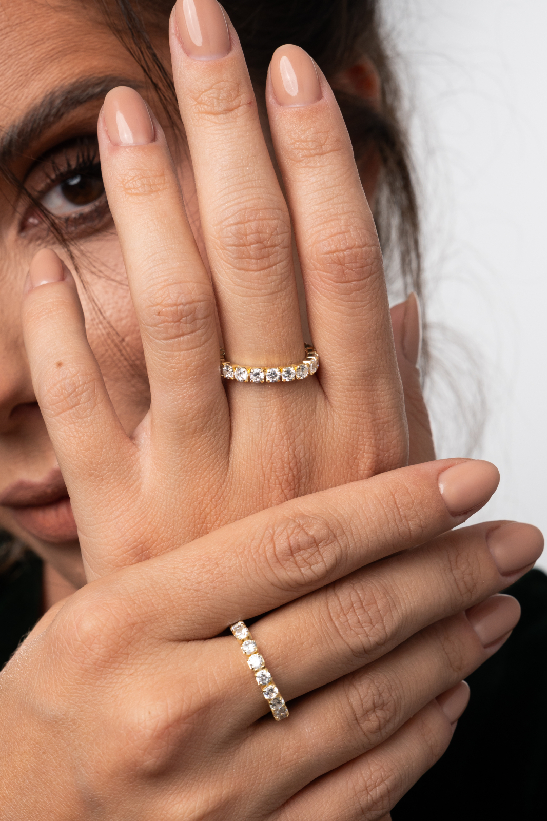 Inel tennis elastic, placat cu aur de 14 karate, cu un design clasic și rafinat. Confortabil datorită structurii flexibile și strălucitor prin detalii fine, este accesoriul perfect pentru un look elegant de zi sau de seară.